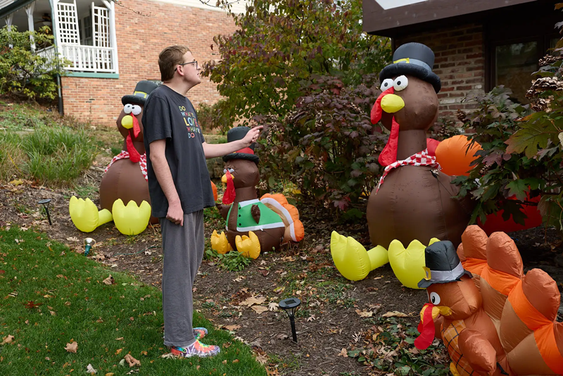 John Funk stands in front of Thanksgiving inflatables on Nov. 15, at his family’s home in McCandless. Funk has started John’s Funky Inflatables, renting repairing, and selling the whimsical fan-puffed yard decorations. (Photo by Kirk Lawrence/Pittsburgh’s Public Source)